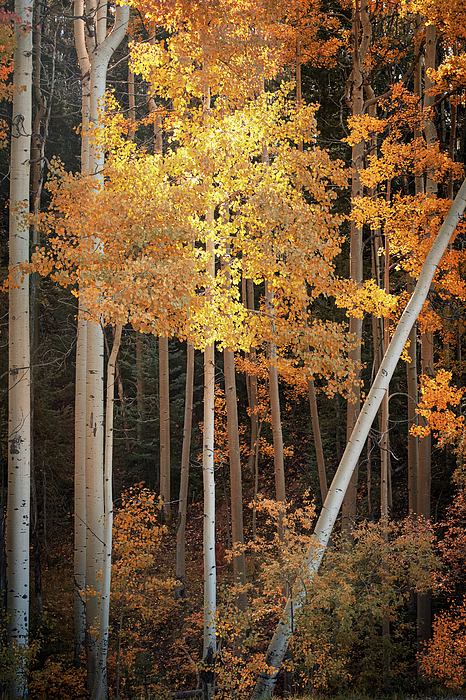 Autumn sunshine brings a special glow to these forest trees in the Sangre de Cristo mountains in New Mexico. Aspen trunks are starkly white. The leaning Aspen tree in the foreground makes way for the beauty behind it.