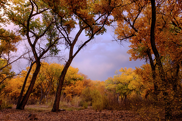 Cottonwood trees frame an evening sky in this colorful scene from the Rio Grande bosque in New Mexico. A storm is gathering in the evening sky, giving the scene a timeless glow.