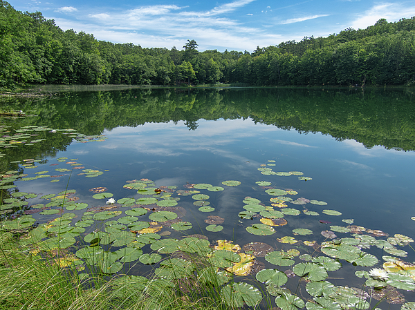 Surrounded by a dense forest, Bowman Lake in western Michigan provides a serene woodland scene Lily pads float on its calm surface. The clear blue... more
