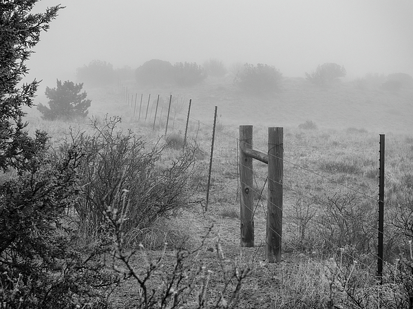 A range fence fades off into the distance of a foggy day in the open spaces of New Mexico.