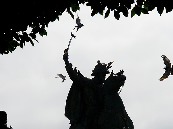 General Iganacio Allende sits astride his horse, sword raised as birds flock around him, one delicately positioned on the end of his sword. This monument is in Plaza de la Soledad, San Miguel de Allende, Guanajuato, Mexico.