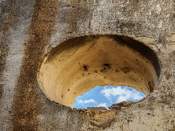 Blue sky with white clouds peeps through what appears to be a hole in the ground. Image made at an old mining facility in Mexico.