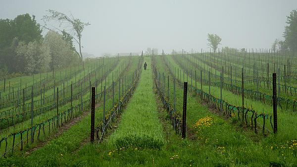 I chanced upon this vineyard scene in the pouring rain on the Mission Peninsula, near Traverse City, Michigan. This lone figure was walking between the staked vines into the mist, his feet leaving a trail in the wet grass.