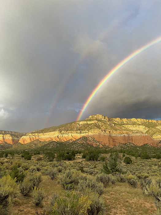 A double rainbow arches over the rugged landscape of northern New Mexico, near Abiquiu. This is known as Georgia O'Keefe country. Vivid colors contrast against a dramatic sky. The foreground consists of a sparsely vegetated plain with scattered green shrubs of sage and chamisa.