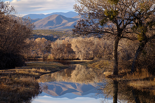 Distant mountains reflect in one of the many ponds at the Bosque del Apache Wildlife Refuge near Socorro, New Mexico. Leaves still hang onto cottonwood trees in this mid December scene. The Bosque del Apache is well known worldwide for its vast number of sandhill cranes, snow geese, and other birds who winter here. It is also home to javalina, white tail deer, coyotes and other mammals.