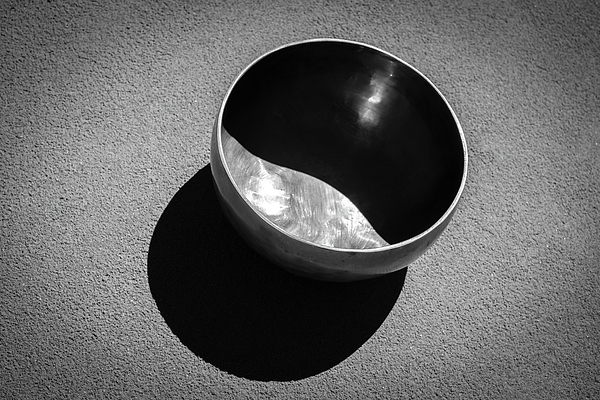 A shiny hammered metal "Singing bowl", also known as a Tibetan, or healing bowl, is placed on a textured adobe surface, casting a distinct shadowt. The inside of the bowl reflects light, contrasting with its darker exterior and the background. It is nearly a yin and yang relationship between shadow and light. The sound of singing bowls is used in meditation, yoga, and healing.