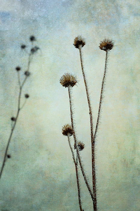 Seed heads of a New Mexico Sunflower (Maximilius) are covered in tiny icicles of frost in this creatively textured image.